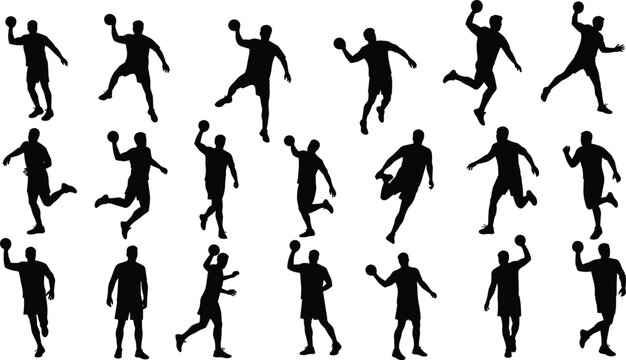 Silhouettes of male handball players performing dynamic sports actions, jumping, running, and throwing ball, vector illustration for design and print