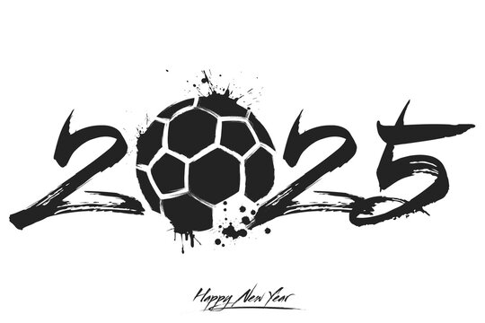 Numbers 2025 and a abstract handball ball made of blots in grunge style. Design text logo Happy New Year 2025. Template for greeting card, banner, poster. Vector illustration on isolated background