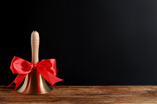 Golden bell with red bow on wooden table near blackboard, space for text. School days
