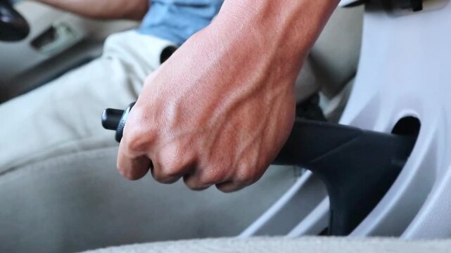 Close-up of a man holding the handbrake while sitting in a car.
