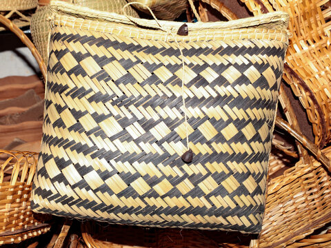 Decorated basket, with a bicolor geometric pattern made with vegetable fiber, according to the indigenous tradition of the Amazon