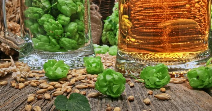 Mugs of cold beer. Hop and malt as beer ingredients.