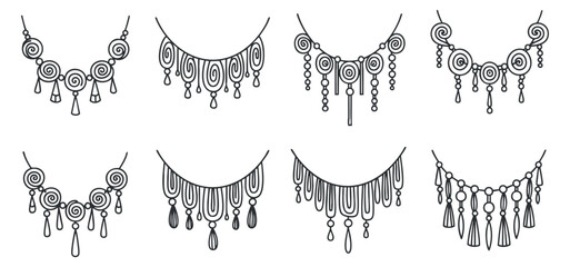 A collection of elegant necklace designs in minimalist black line art style, ideal for fashion and jewelry branding