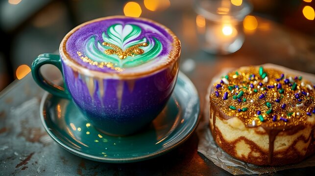 Mardi Gras coffee shop special with colorful latte and king cake