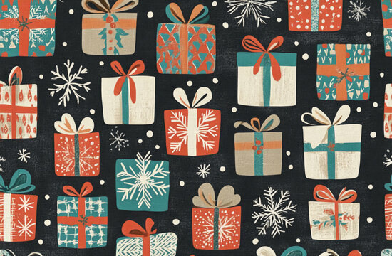 Colorful wrapped gift boxes on a festive background with snowflakes and ribbons