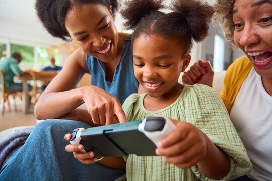Grandmother With Mother And Granddaughter Playing With Handheld Gaming Device At Home With Family