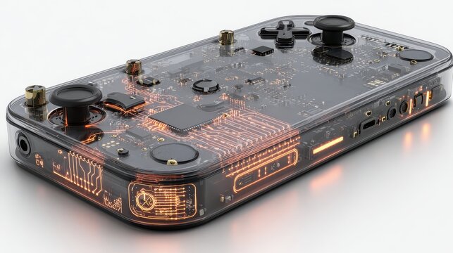 Handheld gaming device with directional pad and analog sticks isolated on a transparent background console