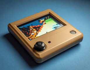 Cartoon style orange handheld gaming device showing various game controls and a screen, entertainment system