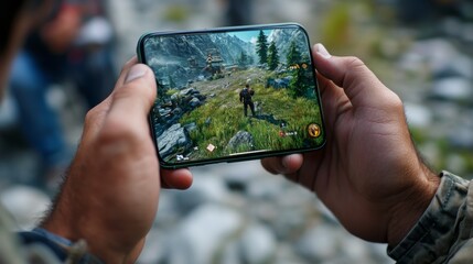 Playing a mobile game in the wilderness