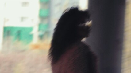 Stylish curly-haired girl in pink faux fur coat and sunglasses turning back and posing for camera as walking under highway overpass with concrete columns. Zoom handheld shot