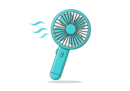 Illustration of a turquoise handheld fan with wind waves on a plain white background design style