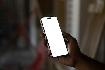 Young man Holding Smartphone with Blank White Screen in Modern Indoor Setting, Perfect for Mockups and Digital Content.