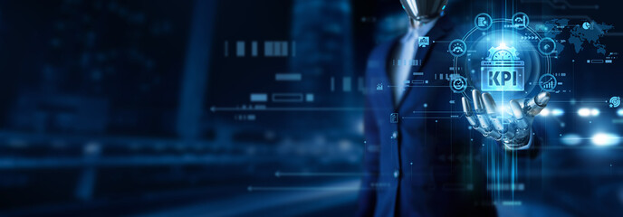 Humanoid robot handholds the key performance indicator. KPI measurement analytics evaluation progress tracking performance improvement goal success efficiency growth.