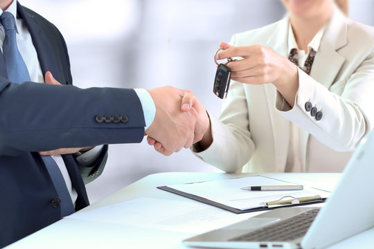 auto mechanic handing over car keys to a female client after repair and shaking hands close-up against the background of automobile at a service station