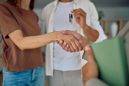 Hand holding the key, a happy woman showing the key to her new apartment, or a female realtor selling the apartment and handing over the key, Focus on giving or showing off the key.