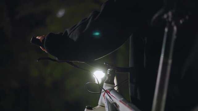 Bike Light Adjustment, Nighttime Bicycle Safety Check, Closeup Of Hand Adjusting Bike Headlight At Night, Reflective Lamp Glow Highlights Careful Preparation Before Urban Cycling Journey