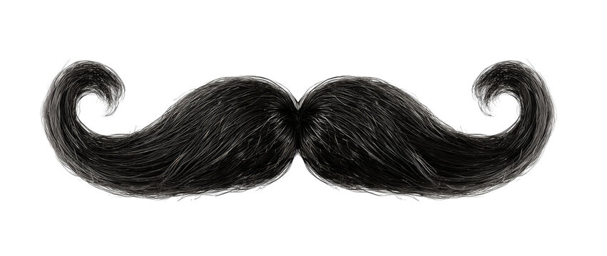 Black handlebar mustache, symbolizing vintage style and masculine grooming, isolated on a white background with a touch of elegance