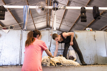 wool handler and shearer working in shearing shed