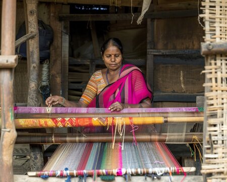 Close-up of an Indian weaver working on a handloom in a village, highlighting traditional craftsmanship.