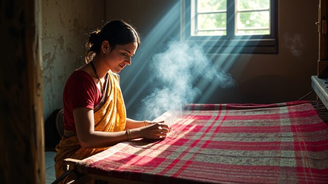A skilled beautiful woman Indian weaver creating intricate patterns on a traditional silk sari using a large handloom in a vibrant workshop