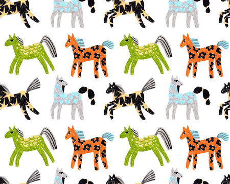 Seamless horse pattern. Colorful stylized horses. Hand drawn with pastels. Decorative folk style.