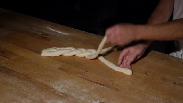 Bakery chef dipping raw dough pieces in white sesame seeds, covering knotted bread rolls in sesame seeds