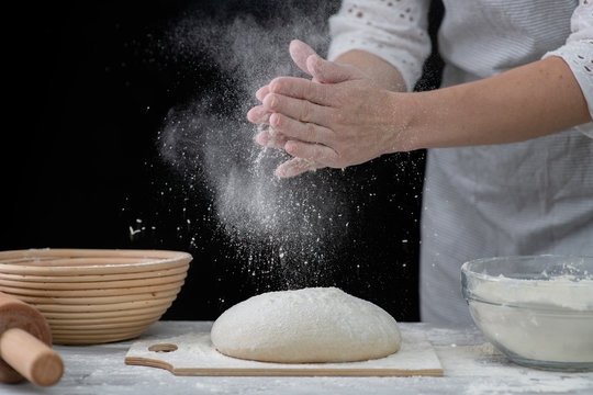 Chef sprinkl flour on a dough for cooking pastries, bread or pizza. Isolated on dark background
