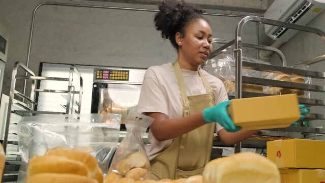 Bakery startup small business delivery. One African American female cook is packing handmade and fresh-baked bread and pastries in boxes and sending for online customer purchases in culinary kitchen.