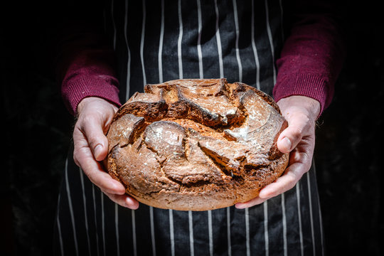 Baker man holding rustic organic loaf of bread in hands - rural bakery