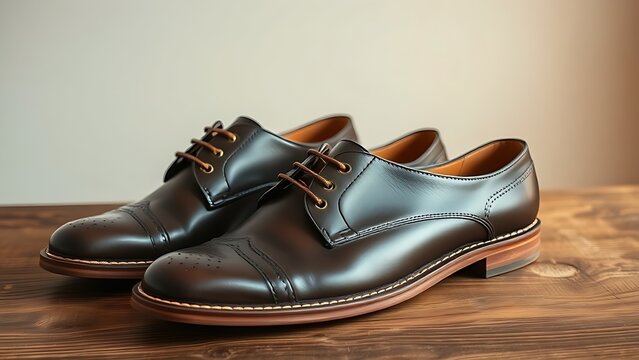 Handmade leather shoes showcased on a wooden surface, highlighting detailed craftsmanship with warm lighting.