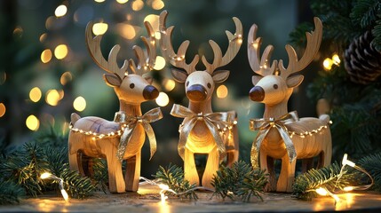 Handmade wooden reindeer figurines decorated with ribbons surrounded by fairy lights