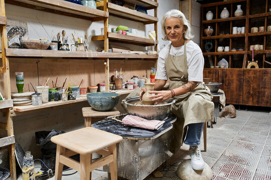 Smiling young male entrepreneur showcases handmade ceramic pottery while live streaming from his small business workspace. Promoting craft products through online marketing and e-commerce.