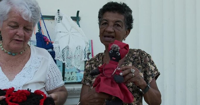 Expert craftspeople displaying handmade dolls, crocheted textiles, showcasing lifelong artisan skills and preserving traditional handicraft techniques with meticulous attention to detail