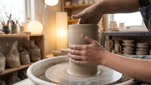 Ceramic decoration factory shows close-up of clay vases on shelves with pots ready for firing in a pottery room