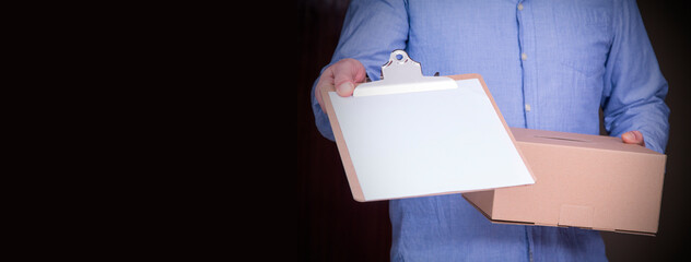 An image of a blank screen computer with a blank white background for advertising text and a handman using a laptop to look up information on a desk at home. A marketing and creative design mockup.