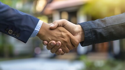 In a modern urban environment, two professionals engage in a car key handover, signifying the transfer of vehicle ownership. The setting showcases sleek buildings and a luxury car
