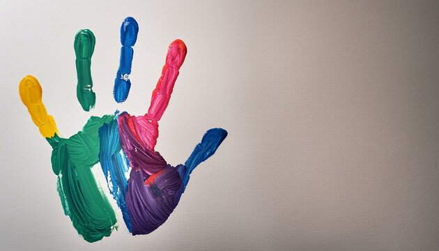 A colorful painted handprint on an empty white background with room for copy. The backdrop for art, education or kids programs.