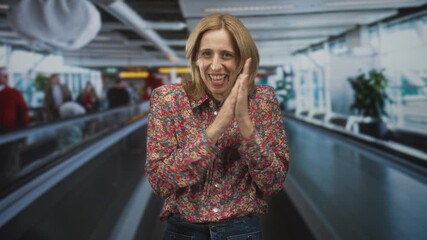 Woman rubbing hands together and smiling on an airport moving walkway wearing floral shirt, visible palms and clasping gesture; cheerful anticipation.