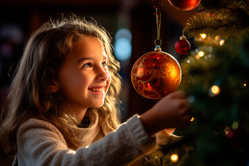 Close up back shot of a girl decorating Christmas tree with red and golden baubles. Beautiful artificial Christmas tree fully decorated in room