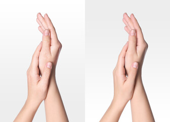 Collage with photos of woman showing hands with dry and moisturized skin on white background, closeup