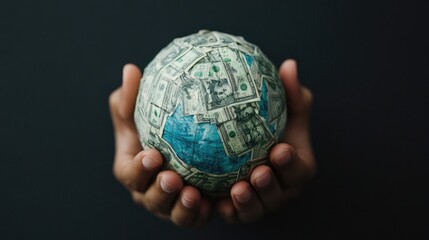 Hand holding a glass globe with a city in it. Concept of a eco green city. Green energy, ESG, renewable resources. Caring for environment. People's hands around the globe.  Earth day, digital ai