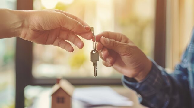 Hands exchanging house keys with a keychain in a warm-toned setting, symbolizing new beginnings, home ownership, and the excitement of moving into a new residence