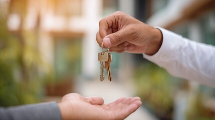 Close-up of two people exchanging keys in front of a new home, symbolizing the moment of ownership, trust, and commitment. Represents a new chapter in real estate or personal life.