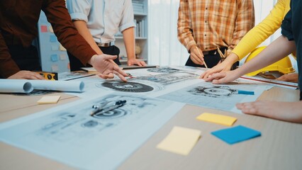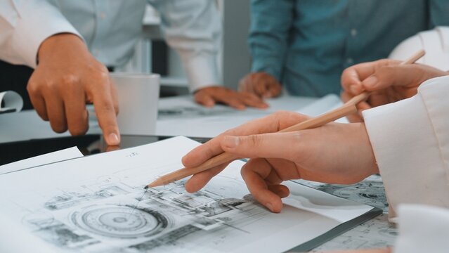 Dynamic teamwork scenario showcasing hands analyzing project blueprints in a modern office. Highlights collaboration, creativity, and innovation in a professional setting. SACTR