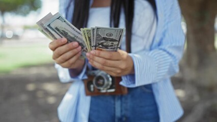 Hispanic woman in a park holding american dollars while wearing a camera.