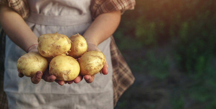 Farmers holding potatoes in hands on farm at sunset. Woman hands holding freshly harvest. Healthy organic food, vegetables, agriculture, close up