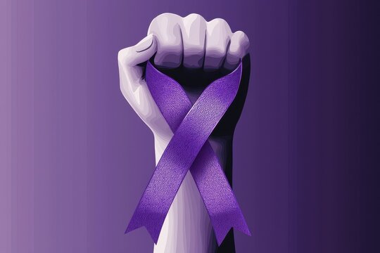 Purple ribbon symbolizing cancer awareness held gently in a hand against a violet background, highlighting support and solidarity