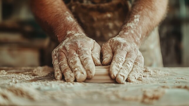 Skilled hands are expertly stretching dough with flour, illustrating the artistry and passion involved in preparing homemade food with love and dedication in a rustic kitchen.