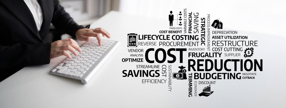 A modern workspace featuring hands typing on a keyboard alongside various keywords related to cost reduction, budgeting, and financial management for effective business practices. Tessel
