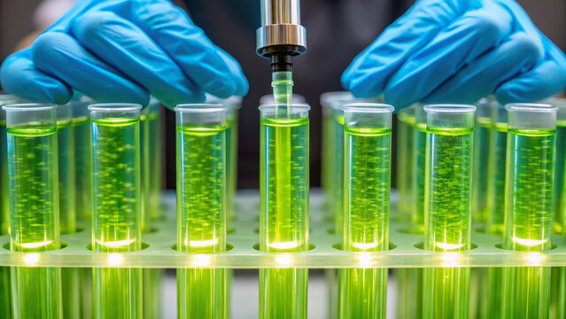 algae biofuel production Laboratory hands conducting an experiment with green liquid in test tubes.